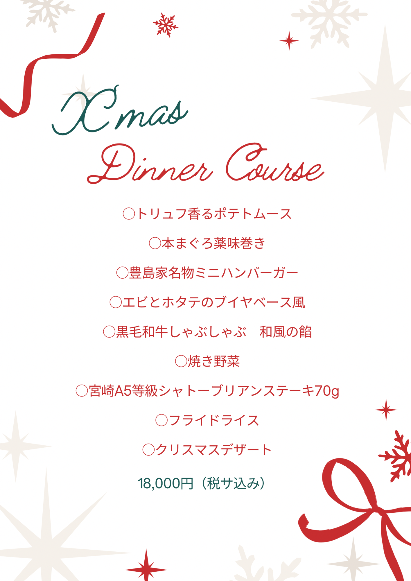 クリスマスコースのご案内 2025年11月26日お知らせtoyoshimake_ Tweet ⭐︎19,20,21日限定ランチコース クリスマスランチコース ⭐︎23,24,25日限定ディナーコース クリスマスディナーコース
